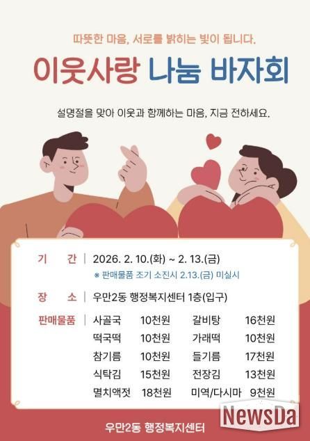 뉴스다 최광묵 기자 | 수원시 팔달구 우만2동 지역사회보장협의체는 설 명절을 앞두고 오는 2월 10일부터 13일까지 우만2동 행정복지센터 청사 입구에서 ‘사랑나눔 바자회’를 개최한다고 밝혔다.