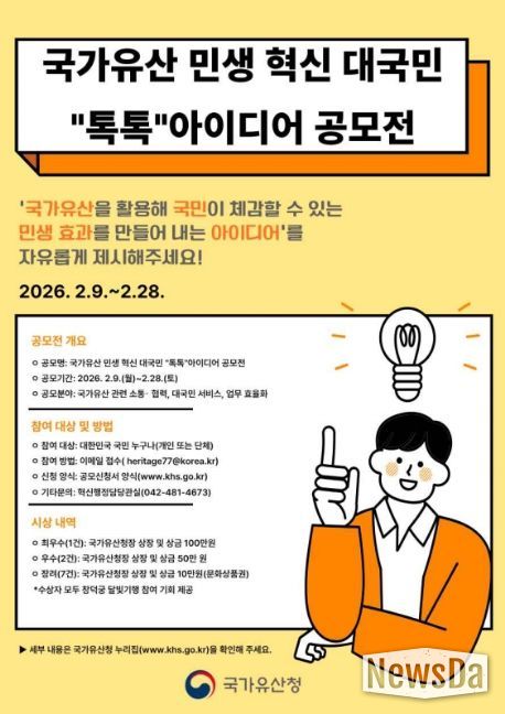 뉴스다 최광묵 기자 | 국가유산청은 2월 9일부터 2월 28일까지 국가유산을 활용해 국민 삶의 질을 높이는 민생형 정책을 발굴하기 위한 '국가유산 민생 혁신 대국민 “톡톡” 아이디어 공모전'을 개최한다.