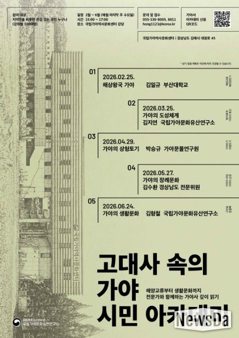 뉴스다 최광묵 기자 | 국가유산청 국립문화유산연구원 국립가야문화유산연구소는 2월부터 6월까지 매월 마지막 주 수요일, 국립가야역사문화센터 강당(경남 김해시)에서 시민들을 대상으로 '고대사 속의 가야' 시민 아카데미를 개최한다.