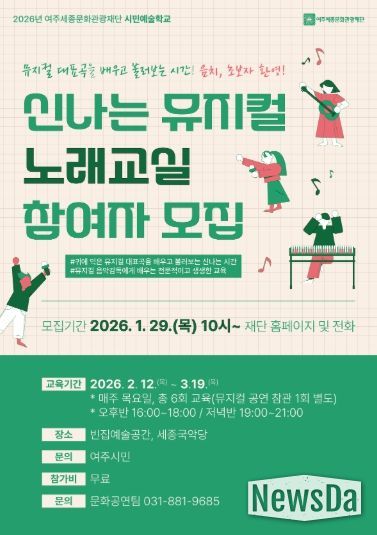 뉴스다 최광묵 기자 | 여주세종문화관광재단은 오는 12일부터 시민예술학교 프로그램의 일환으로 ‘신나는 뮤지컬 노래교실’을 운영한다.