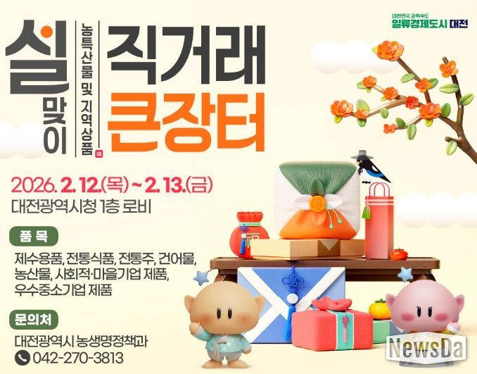 뉴스다 최광묵 기자 | 대전광역시는 다가오는 설 명절을 맞아 시민들의 장바구니 부담을 덜고 지역 농가의 판로를 지원하기 위해 오는 2월 12일부터 13일까지 이틀간 시청 1층 로비에서‘설맞이 우수 농·특산물 및 지역상품 직거래 장터’를 개최한다.