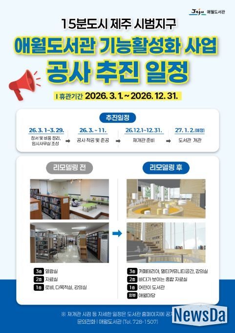 뉴스다 최광묵 기자 | 제주시 애월도서관은 ‘15분도시 도서관 기능활성화 사업’ 추진에 따른 전면 리모델링 공사로 3월 1일부터 12월 31일까지 휴관한다.