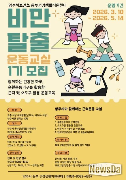 뉴스다 최광묵 기자 | 양주시보건소 동부 건강생활지원센터에서 지역 주민의 만성질환 예방과 건강한 생활 습관 형성을 위해 순환운동기구를 활용한 근력운동 프로그램인 2026년도 ‘비만탈출 운동교실’ 1기 참여자를 모집한다.