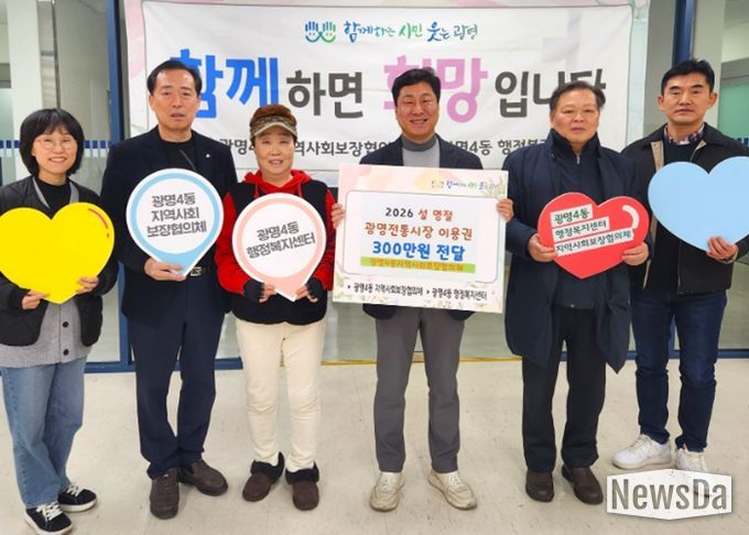 뉴스다 최광묵 기자 | 광명시 광명4동 지역사회보장협의체는 11일 설 명절을 맞아 관내 저소득 취약계층 50가구에 총 300만 원 상당의 광명전통시장 이용권을 전달했다.