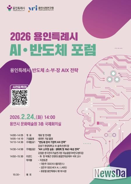 뉴스다 최광묵 기자 | 용인특례시는 오는 24일 오후 2시 용인문화예술원 국제회의실에서 ‘반도체 소재·부품·장비(소·부·장) AIX 전략 포럼’을 개최한다.