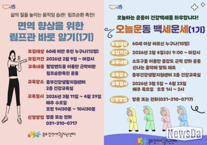 뉴스다 최광묵 기자 | 시흥시보건소 중부건강생활지원센터에서는 일상 속 움직임이 쌓여 내일의 건강한 삶으로 이어질 수 있도록, 지역주민 대상 신체활동 프로그램 ‘오늘 운동 백세 운세’와 ‘면역 향상을 위한 림프관 바로 알기’를 운영한다.