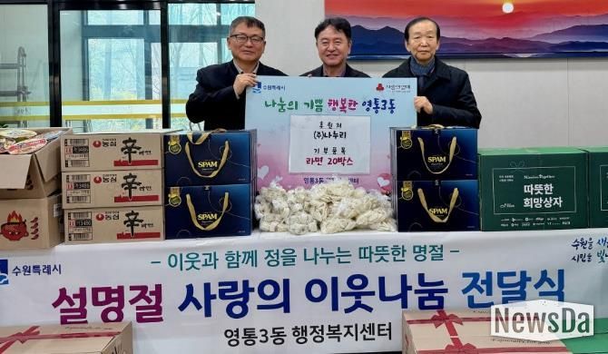 뉴스다 최광묵 기자 | 수원시 영통구 영통3동 행정복지센터는 지난 11일, 관내 폐기물수거업체인 ㈜나누리로부터 설 명절을 맞아 취약계층을 위한 라면 20박스를 기탁받았다.