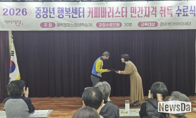 뉴스다 최광묵 기자 | 양평군은 지난 11일 군민을 대상으로 운영한 ‘2026년 양평군 커피바리스타 신규 양성과정’을 3주간의 교육 일정을 마무리하고 수료식을 개최했다고 밝혔다. 이번 과정은 관내 베이비부머 세대의 역량 강화를 통해 사회 공헌과 재취업 기회를 제공하기 위해 기획·운영됐다.