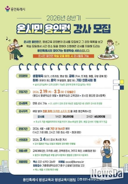 뉴스다 최광묵 기자 | 용인특례시는 19일부터 3월 3일까지 시민이 원하는 시간과 장소로 강사가 찾아가는 배달학습 ‘온시민 용인런’ 강사를 모집한다고 밝혔다.