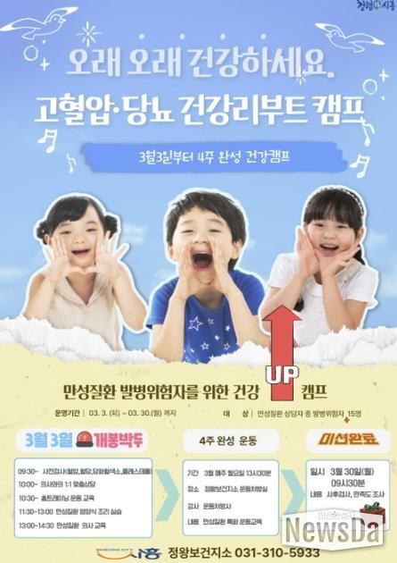 뉴스다 최광묵 기자 | 시흥시는 혈압ㆍ당뇨ㆍ이상지질혈증 경계 단계에 있는 시민 15명을 대상으로 만성질환 이환을 예방하기 위한 ‘고혈압ㆍ당뇨 건강 리부트 캠프’를 오는 3월 3일부터 4주간 운영한다.