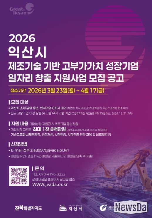 한편, 이번 사업은 전북특별자치도 공모에 선정돼 추진하는 민관 협력 사업으로, 자세한 내용은 익산시 누리집이나 ㈔전북벤처산업발전협의회 누리집 공고문을 통해 확인하면 된다.