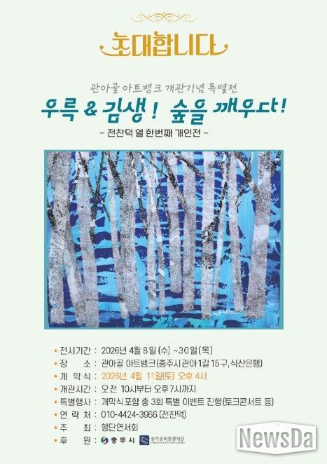 뉴스다 최광묵 기자 | 충주시는 구 조선식산은행 건물을 복합문화공간 ‘관아골 아트뱅크’로 새롭게 단장하고 첫 특별전으로 전찬덕 작가의 ‘우륵&김생! 숲을 깨우다’를 4월 8일부터 30일까지 개최한다고 3일 밝혔다.