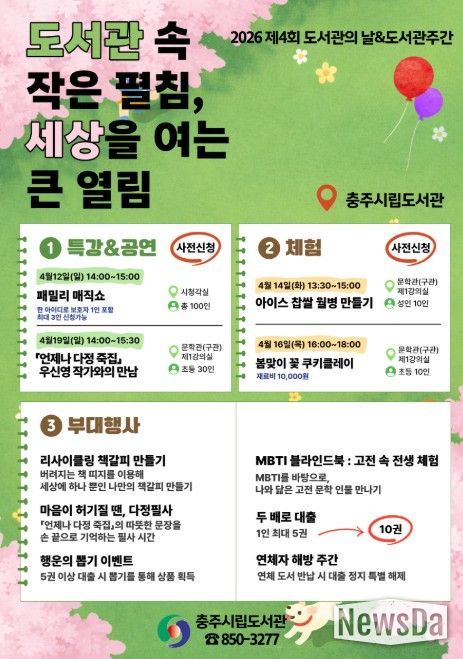 뉴스다 최광묵 기자 | 충주시립도서관은 제4회 도서관의 날과 제62회 도서관주간을 맞아 ‘도서관 속 작은 펼침, 세상을 여는 큰 열림’을 주제로 다양한 독서문화행사를 운영한다고 3일 밝혔다.