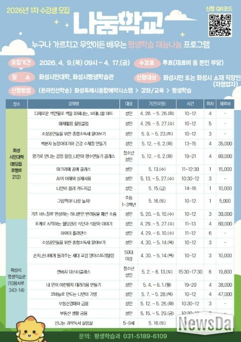 뉴스다 최광묵 기자 | 화성특례시는 시민 간 지식과 재능을 나누는 평생학습 프로그램 ‘나눔학교’의 2026년 1차 수강생을 오는 4월 9일부터 4월 17일까지 선착순으로 모집한다.