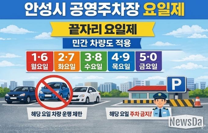 5부제가 적용되는 공영주차장은 안성맞춤공감 주차장을 비롯해 금산동, 아양2·3, 원곡면, 대덕 내리·광덕 공영주차장 등 총 7개소다.