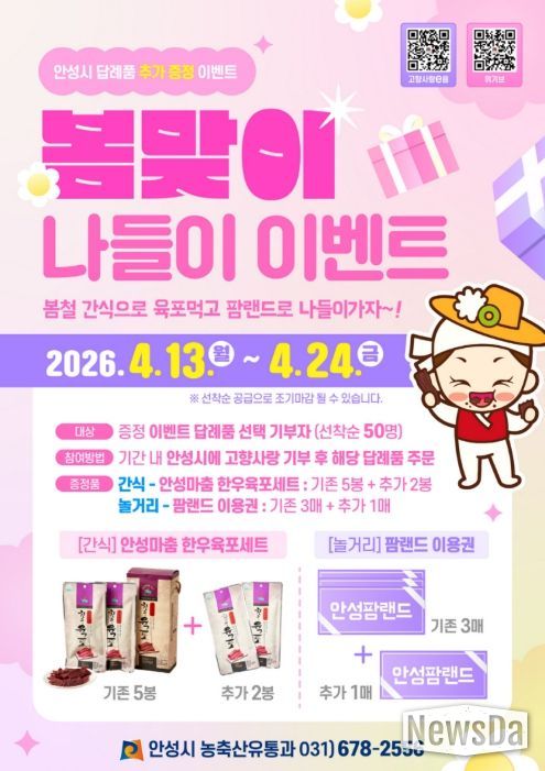 안성시 관계자는 “봄나들이와 어울리는 간식 및 체험형 답례품을 연계해 기부자의 만족도를 높이고자 이번 이벤트를 마련했다”며, “앞으로도 계절별 특색을 살린 다양한 이벤트를 통해 고향사랑기부 참여를 확대해 나가겠다”고 말했다.