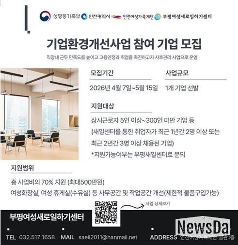 뉴스다 최광묵 기자 | 부평여성새로일하기센터는 여성친화적 근무환경 조성과 경력보유여성의 안정적인 고용 확대를 위해 '2026년 기업환경개선사업' 참여기업을 모집한다고 밝혔다.