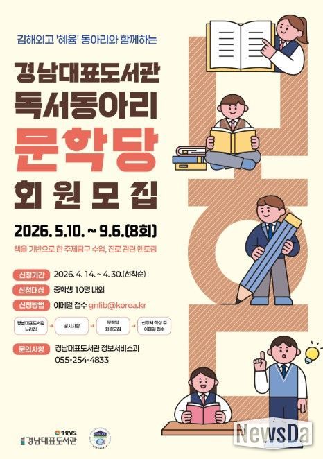 뉴스다 최광묵 기자 | 경남대표도서관은 김해외국어고등학교 교육나눔동아리 ‘혜윰’과 함께 도내 중학생 대상 독서동아리 ‘문학당’을 운영하고, 참여 학생을 4월 14일부터 30일까지 선착순 10명을 모집한다고 밝혔다.