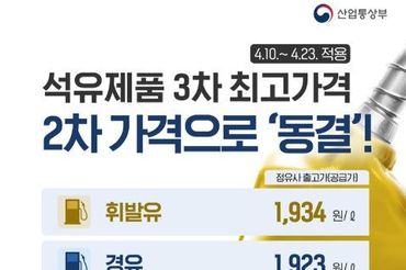 산업통상부, 석유제품 3차 최고가격 2차 가격으로 '동결'