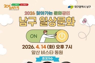 대구 남구, ‘2026 찾아가는 문화공연’ 4월 14일 앞산비스타동원 찾아가는 음악회 개최