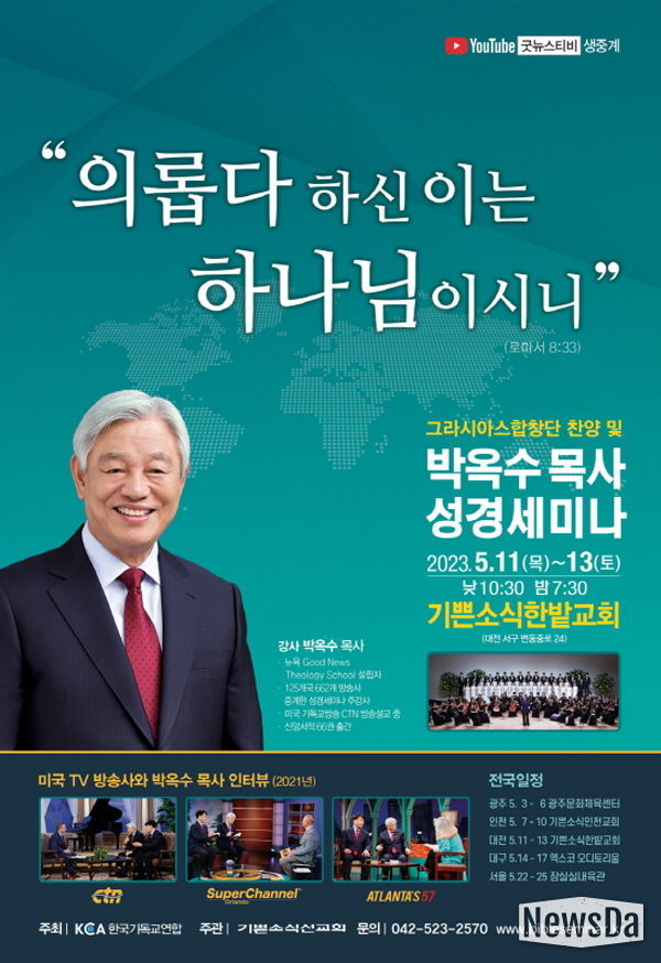뉴스다 최광묵 기자 | ‘죄사함의 복음’으로 전 세계 기독교를 선도하는 ‘박옥수 목사 성경세미나’가 대전·충청지역 시민들을 대상으로 5월 11일(목)부터 13일(토)까지 기쁜소식 한밭교회에서 개최된다.