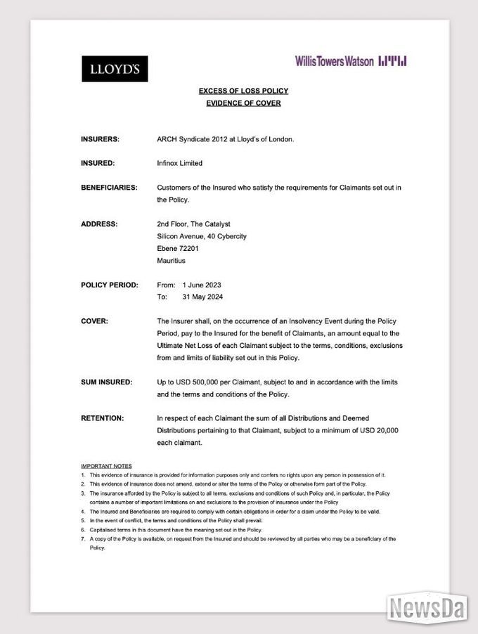 인피녹스는 세계 최대 보험 연합 LLOYDS 보증 아래, 은행 파산 등 지급 불능 사태에 이를 경우 청구인당 최대 $500,000 USD 까지 보호받을 수 있다.