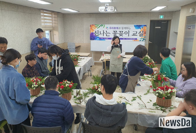 뉴스다 최광묵 기자 | 24일 오후 3시 부천시 장애인회관에서는 발달장애청소년 10명이 꽃바구니 만드는 방법을 배우는 수업이 한창 진행되고 있었다.