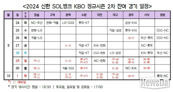뉴스다 류대현 기자 | KBO는 24일(화) 2024 신한 SOL뱅크 KBO 정규시즌 2차 잔여 경기 일정을 확정했다.