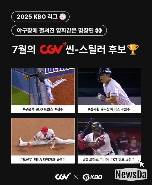 뉴스다 류대현 기자 | KBO와 CGV가 공동 제정한 ‘월간 CGV 씬-스틸러상’의 7월 수상자 후보로 LG 구본혁, 두산 김재환, KIA 오선우, KT 로하스 등 총 4명의 선수가 선정됐다.