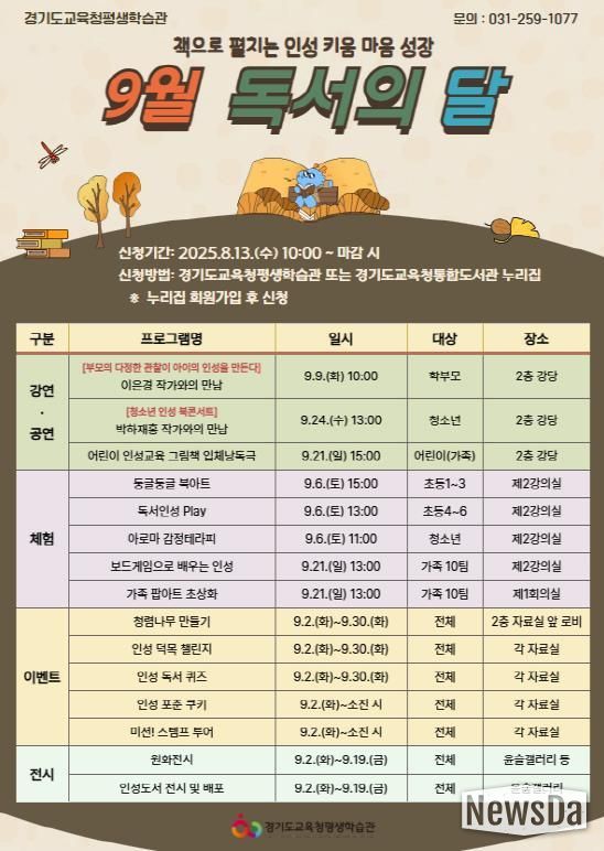 뉴스다 최광묵 기자 | 경기도교육청평생학습관이 ‘책으로 펼치는 인성 키움 마음 성장’을 주제로 䃹월 독서의 달’행사를 운영한다.