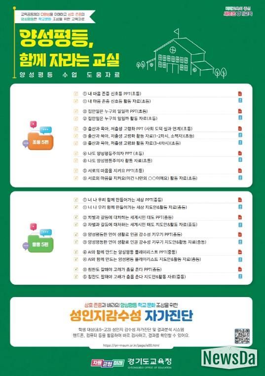 뉴스다 최광묵 기자 | 경기도교육청이 1일부터 7일간 ‘2025 학교 양성평등 실천 주간’ 운영에 따른 수업 도움 자료 ‘양성평등, 함께 자라는 교실’을 학교 현장에 보급한다.