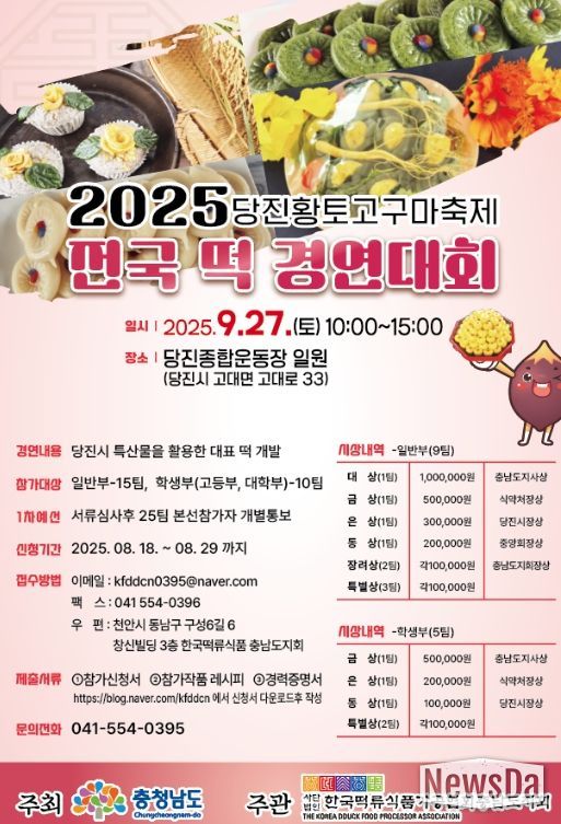뉴스다 최광묵 기자 | 당진시는 오는 27일 오전 10시 50분부터 오후 3시까지 당진종합운동장 일원에서 ‘2025년 전국 떡 경연대회’를 개최한다고 24일 밝혔다.