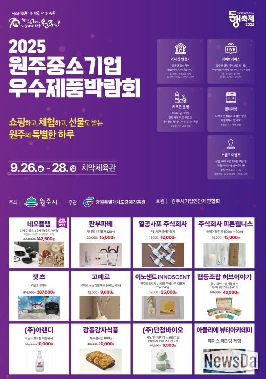 뉴스다 최광묵 기자 | 원주시가 주최하고 강원특별자치도경제진흥원이 주관하는 ‘2025 원주 중소기업 우수제품 박람회’가 오는 26일 오전 10시 30분, 치악체육관 무대에서 개막식을 열고 28일까지 3일간 이어지는 행사의 막을 올린다.
