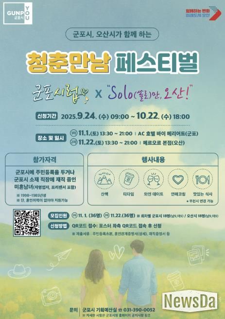 뉴스다 최광묵 기자 | 군포시는 오는 11월 1일과 11월 29일 두 차례에 걸쳐 청년 미혼남녀를 위한 만남 행사를 오산시와 공동 개최한다고 밝혔다.