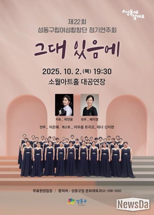 뉴스다 최광묵 기자 | 서울 성동구는 오는 10월 2일 저녁 7시 30분 소월아트홀에서 성동구립 여성합창단 '제22회 정기 공연'을 개최한다고 밝혔다. 공연 부제는 '그대 있음에'로 가을밤, 구민들에게 사랑과 위로의 하모니를 선사할 예정이다.