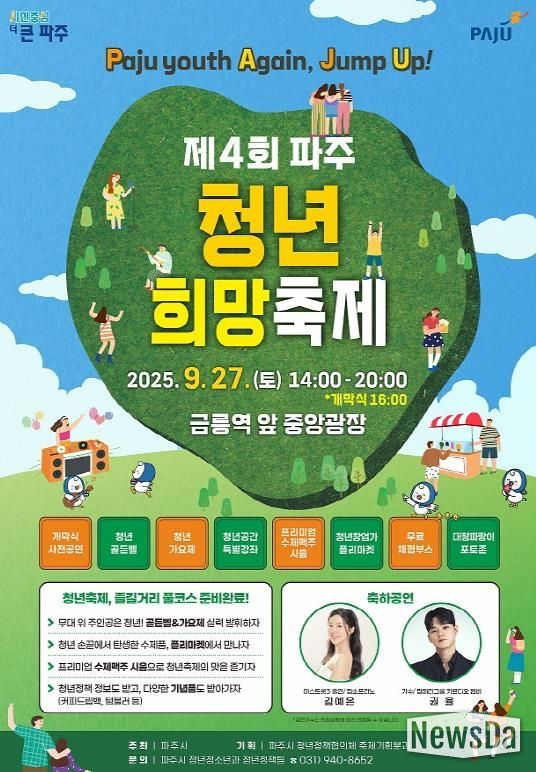 뉴스다 최광묵 기자 | 파주시는 청년의 날을 맞아 청년들이 함께 소통하고 공감하며 즐길 수 있는 교류의 장인 ‘제4회 파주 청년희망축제’를 오는 27일 14시부터 20시까지 금릉역 앞 중앙광장에서 개최한다.