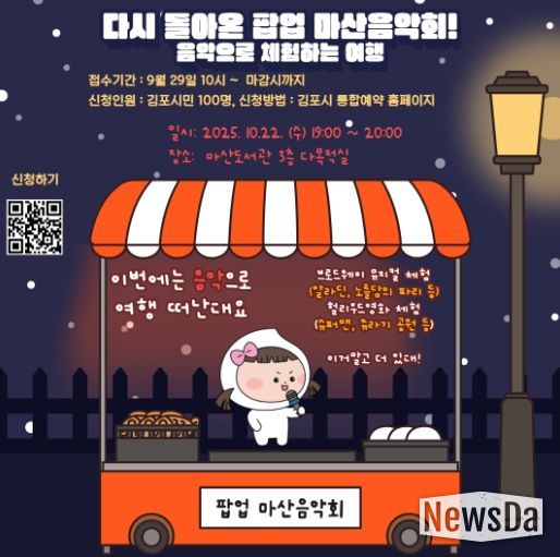 참가 신청은 9월 29일 오전 10시부터 김포시 통합예약시스템을 통해 가능하다. 마산음악회는 선착순 100명, 우리가 여행을 하는 이유 특별강연은 70명을 모집하고, 마지막 프로그램은 추후 도서관 홈페이지에서 별도 안내할 예정이다.