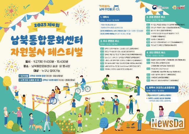 뉴스다 최광묵 기자 | 통일부 남북통합문화센터(서울시 강서구 소재)는 9월 27일, 지역사회와 함께하는 '자원봉사 페스티벌'을 개최한다.