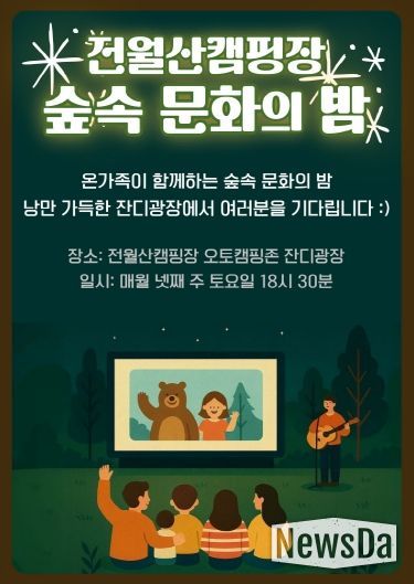 뉴스다 최광묵 기자 | 세종특별자치시시설관리공단(이사장 조소연)은 오는 9월 27일부터 전월산국민여가캠핑장에서 '숲속 문화의 밤'프로그램을 정기 운영한다고 밝혔다.