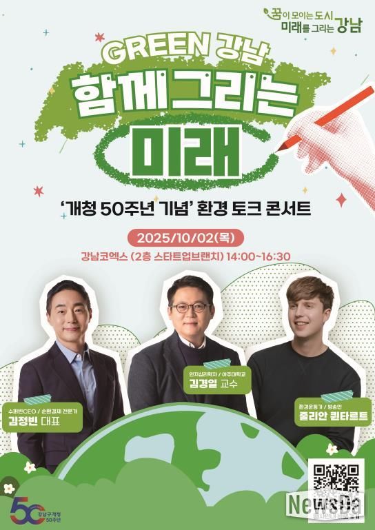 뉴스다 최광묵 기자 | 꿈이 모이는 도시, 미래를 그리는 강남구가 개청 50주년을 기념해 오는 10월 2일 오후 2시 코엑스 스타트업브랜치에서 ‘GREEN 강남, 함께 그리는 미래’를 주제로 ‘환경 토크 콘서트’를 개최한다.