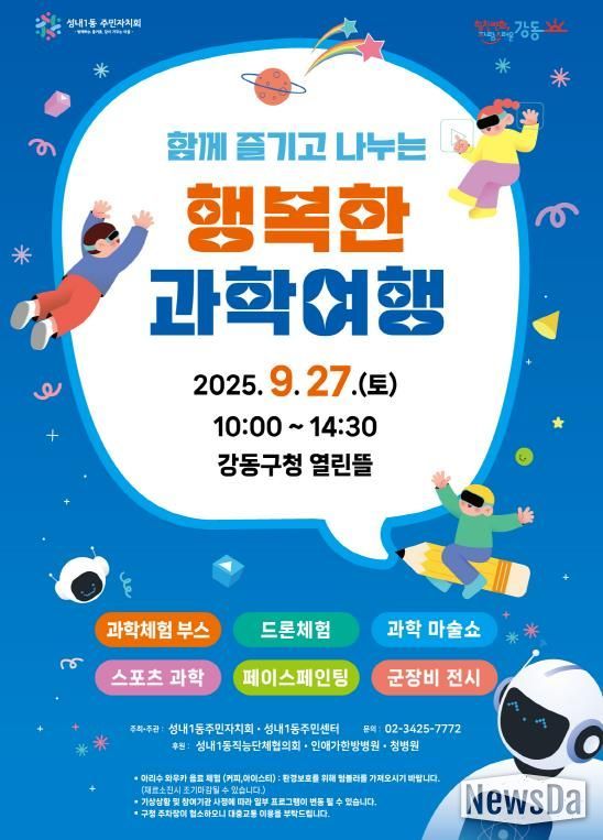 뉴스다 최광묵 기자 | 강동구 성내1동은 오는 27일 10시부터 14시 30분까지 강동구청 열린뜰에서 ‘제5회 함께 즐기고 나누는 행복한 과학여행’ 축제를 개최한다고 밝혔다.