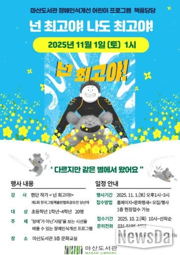 뉴스다 최광묵 기자 | 김포시 마산도서관은 오는 11월 1일 오후 1시부터 3시까지, 장애인식개선 어린이 프로그램 책풍당당 '넌 최고야! 나도 최고야!'을 운영한다.