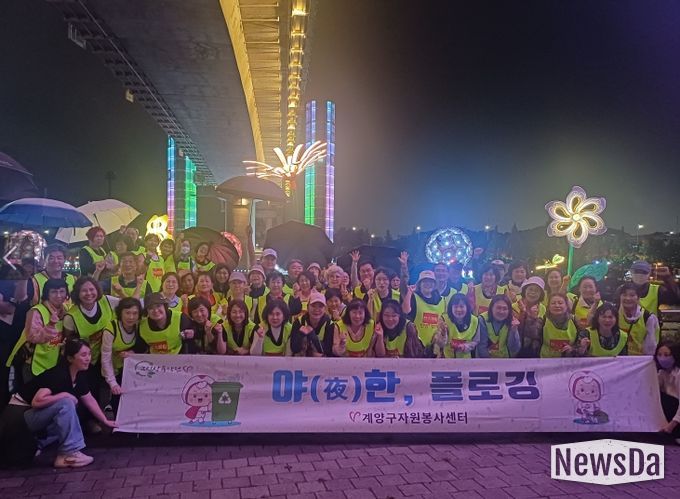 뉴스다 최광묵 기자 | 인천 계양구자원봉사센터는 지난 24일 저녁, ‘계양아라온 아트웨이(빛의 거리 3단계)’와 ‘가을꽃 국화축제’가 열리는 현장에서 자원봉사자 74명과 함께 ‘야(夜)한 플로깅’ 봉사활동을 진행했다.