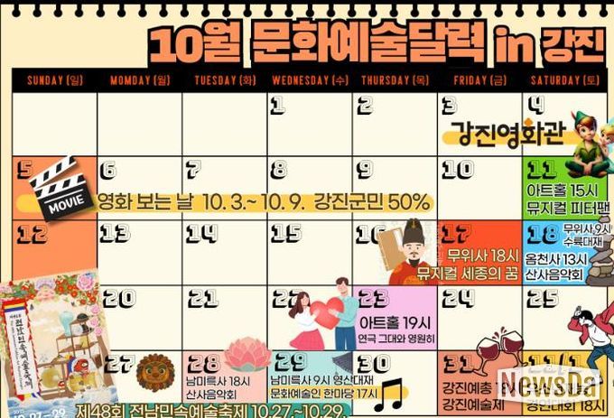 뉴스다 최광묵 기자 | 강진군은 선선한 가을바람과 함께 군민의 문화적 감수성을 채워줄 다채로운 문화예술 행사를 10월 집중 운영한다고 29일 밝혔다.