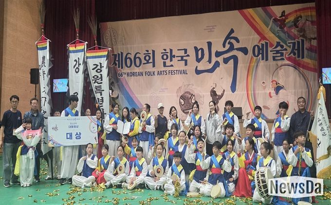 뉴스다 최광묵 기자 | 강릉농악보존회가 9월 28일 충북 영동군에서 열린 ‘제66회 한국민속예술제’ 청소년부 경연대회에서 강원특별자치도 대표로 출전하여 대상인 대통령상 수상의 영예를 안았다.