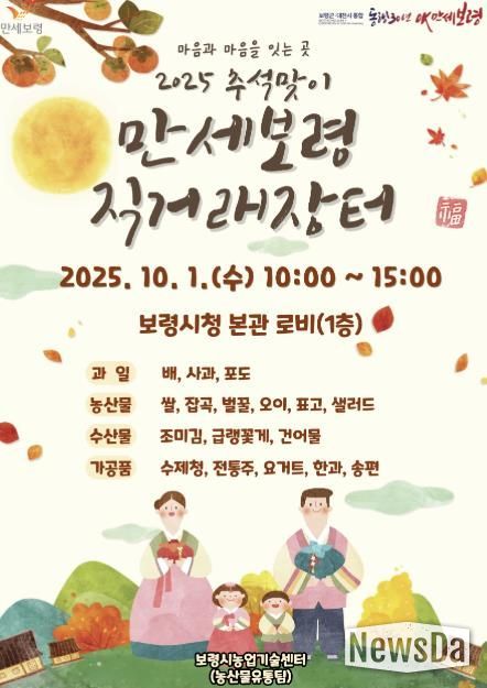 뉴스다 최광묵 기자 | 보령시는 추석을 맞아 10월 1일 보령시청 본관 1층 로비에서 ‘2025 추석맞이 만세보령 농특산물 직거래장터’를 운영한다고 밝혔다.