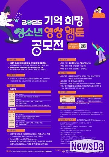 뉴스다 최광묵 기자 | 경기도교육청4.16생명안전교육원이 ‘2025 기억 희망 청소년 영상‧웹툰 공모전’을 개최한다.