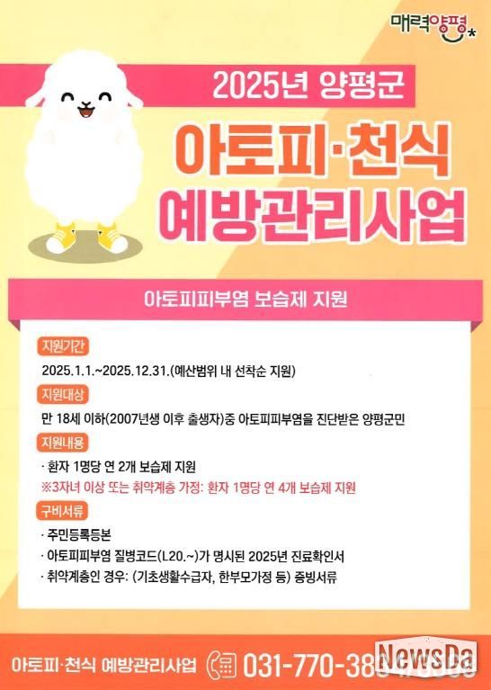 뉴스다 최광묵 기자 | 양평군은 지역사회 중심의 알레르기질환 조기 발견과 적절한 치료를 위해 2025년 연중 ‘아토피 피부염 보습제 지원’과 ‘취약계층 알레르기질환 의료비 지원’을 실시한다고 밝혔다.