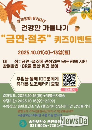 뉴스다 최광묵 기자 | 평택시 송탄보건소에서 오는 10월 1일부터 13일까지 시민 누구나 참여할 수 있는 ‘건강한 가을나기 금연·절주 퀴즈 이벤트’를 진행한다.