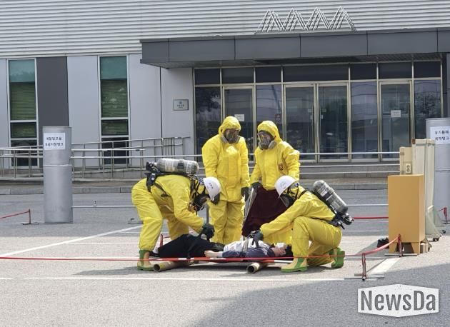 유해화학물질인 메틸 알코올 누출로 인한 화재 상황을 설정해 진행한 이 훈련은 자체 매뉴얼에 따라 ▲비상 상황 긴급전파 ▲소방대 초동 조치 ▲화재 진압 ▲인명구조 ▲사고 복구 등으로 구성됐다.